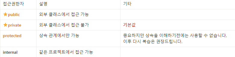 변수나 함수 앞에 public, private, protected, internal 중 한개를 선언하면 됩니다.