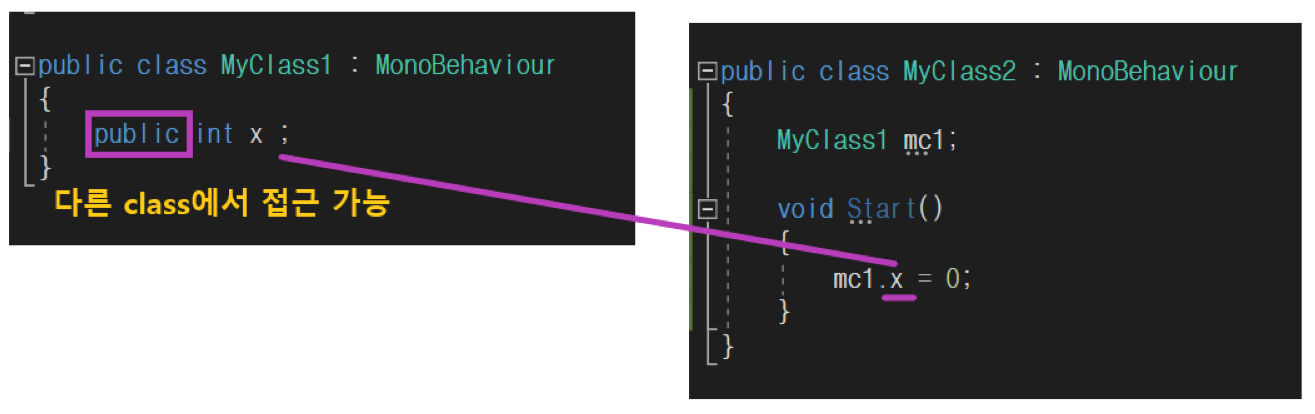 클래스에서 public 로 선언된 변수는 외부 클래스에서 접근할 수 있습니다.