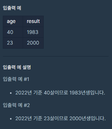 나이 age가 주어질 때, 2022년을 기준 출생 연도를 return 하는 solution 함수를 완성해주세요.