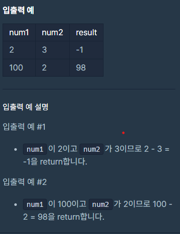 정수 num1과 num2가 주어질 때, num1에서 num2를 뺀 값을 return하도록 soltuion 함수를 완성해주세요.