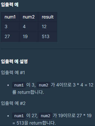 정수 num1, num2가 매개변수 주어집니다. num1과 num2를 곱한 값을 return 하도록 solution 함수를 완성해주세요.