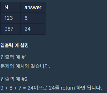 예를들어 N = 123이면 1 + 2 + 3 = 6을 return