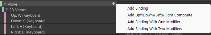 Move Action 수정 → Add Up Down Left Right Composite 추가 → WASD 설