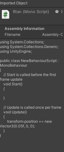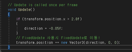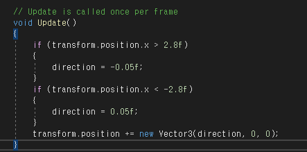 위를 보면 uodate에 transform.position += new Vector3(0.05f, 0, 0); 라는 코드를 입력하고