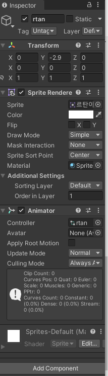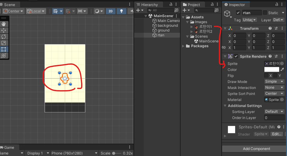 위와같이 캐릭터는 생성 되었지만 order in layer를 0으로 해서 캐릭터가 background에 겹쳐버림