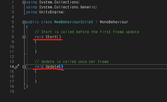 동작에서 꼭 알아야 할 두가지 함수 → start (너는 태어날 때) / update (매 순간 이렇게 해라)