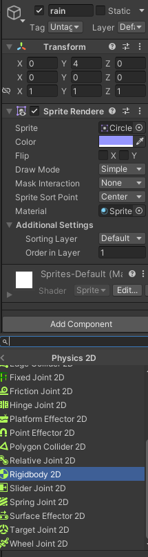 생성한 오브젝트가 떨어지게 하기위해서는 Rigidbody2D를 이용한다.