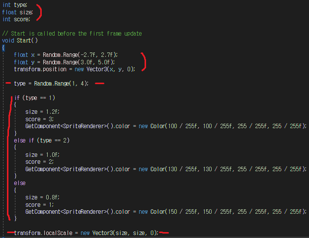 랜덤 타입의 type = Random.Range(1, 4); 을 적용