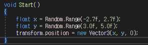 범위내에 transform.position = new Vector3(x, y, 0); 생성된다는 뜻이다.