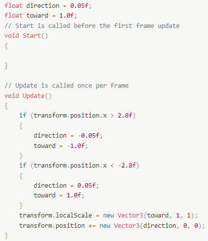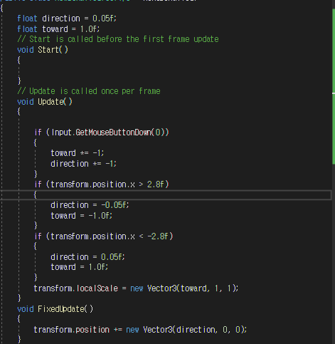위와 같이 toward를 이용해서 float toward = 1.0f; 변수을 주고 update에 transform.localScale를