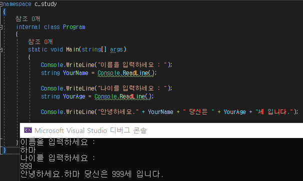 C#에서 콘솔 입력을 받을 때는 Console.ReadLine 메소드를 사용